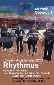 Zu den Bildern, Objekten und Skulpturen wird wieder ein Tanzensemble seine eigens entwickelte Performance zeigen. Den musikalischen Beitrag übernimmt ein im Landkreis Rottweil bekannter Musiker. Seien Sie gespannt!